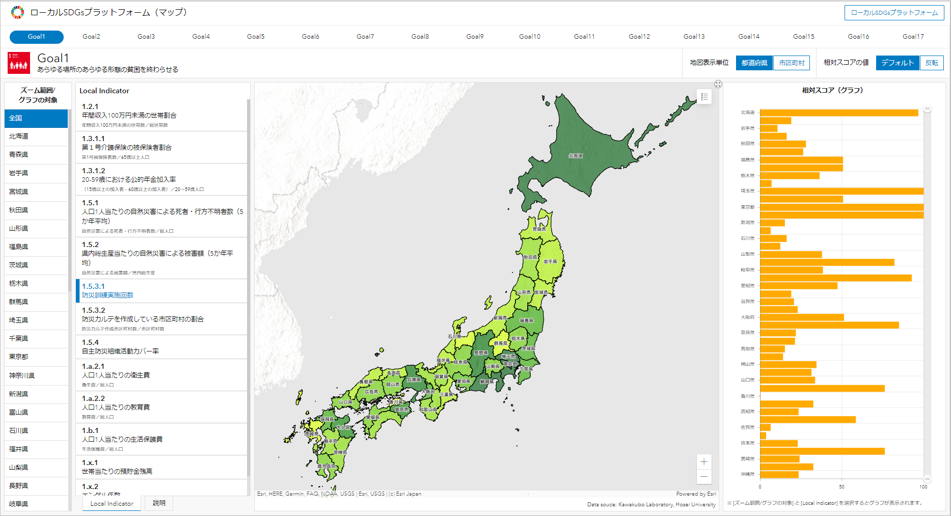慶應義塾大学理工学部システムデザイン工学科 川久保俊研究室では、自治体における SDGs 達成に向けた取り組みや成功事例を共有するオンライン SDGs プラットフォーム「Local SDGs Platform」を運営しており、当社も協力しています。そのひとつとして、地方創生 SDGs ローカル指標リストに準拠したデータを用いて、都道府県、市区町村における SDGs の進捗状況をマップで確認できる機能を実装し、2023 年 3 月に公開しました(公開当時、川久保俊研究室は法政大学に所属)。