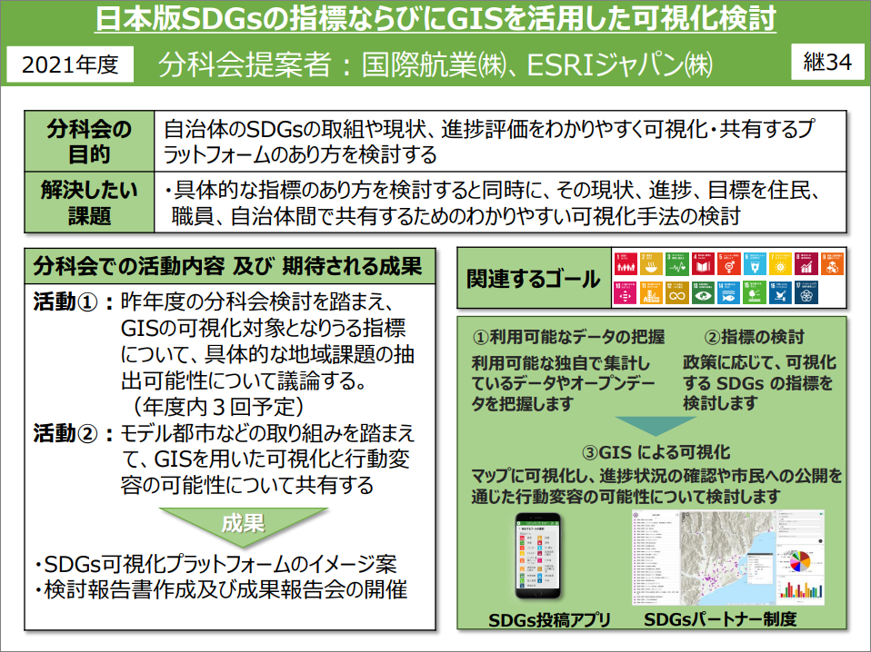 自治体の SDGs の取り組み・現状・進捗評価をわかりやすく可視化・共有するプラットフォームの在り方を検討するため、GIS 活用・知見共有を目的として、「日本版 SDGs 指標ならびに GIS を活用した可視化検討」分科会を国際航業株式会社と共同で開催しました。