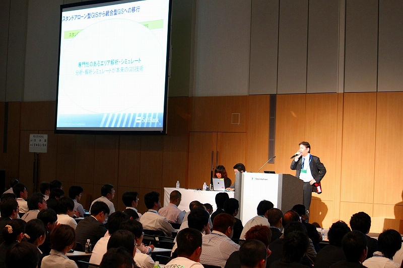 基調講演は6月3日(木)、4日(金)の午前中に行われました。3日(木)の講演では開催テーマである、GIS: Designing Our Futureの意味合いを、設計科学の観点から福井ESRIジャパンユーザ会会長が解説した後、酪農学園大学、金子教授より、環境保全活動にGISとリモートセンシングを地球規模からある特定の地域まで幅広く柔軟に活用する試みが紹介されました。米国ESRI社、セールスディレクター、Christopher Cappelli氏の講演では、企業活動における、課題解決のための地理学的なアプローチの重要性が、資源管理、計画と分析、現場の作業、情報の分析、相互連携の側面から解説されました。4日(金)の講演では、ソフトバンクモバイル株式会社、設備エンジニアリング本部、エリア情報企画部部長柴山氏より、屋外業務におけるGISを活用した業務の効率化、及び将来における業務の未来像、そしてGISやITインフラのあり方など多彩なトピックスが紹介されました。科学警察研究所、犯罪行動科学部長、原田氏からは、メディアに取り上げられるような大きな犯罪のみならず、膨大な件数に及ぶ陰に隠れた犯罪をいかにGISと地域の活動を用いて抑止するのか、その取り組みが紹介されました。最後に、米国ESRI社、Myles Sutherland氏から、ESRIのモバイルソリューションの全体像と、注目のモバイルGISアプリケーション、ArcGIS for iPhone*が紹介されました。両日とも講演会場は満席となり、参加者の皆様は興味しきりの様子でした。(*国内サポート検討中)