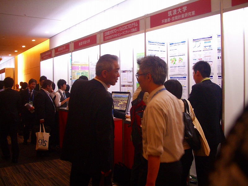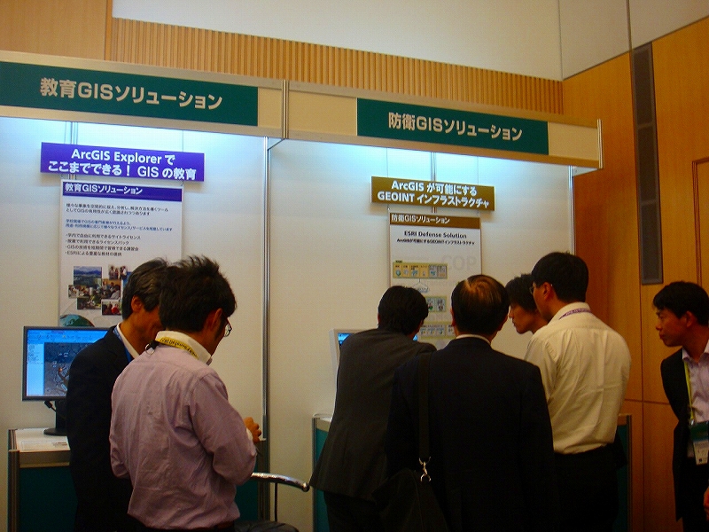 ESRIジャパンの5つのソリューション(地理空間情報流通、自治体・防災、ビジネス、教育、防衛)によるデモンストレーションを中心とした展示では、各ブースとも参加者が熱心に説明を聞いたり、活発な質疑応答が終日行われました。また、京都大学をはじめとした研究チームによって開発された大規模災害時の生活再建支援システムのパネル展示も行われました。