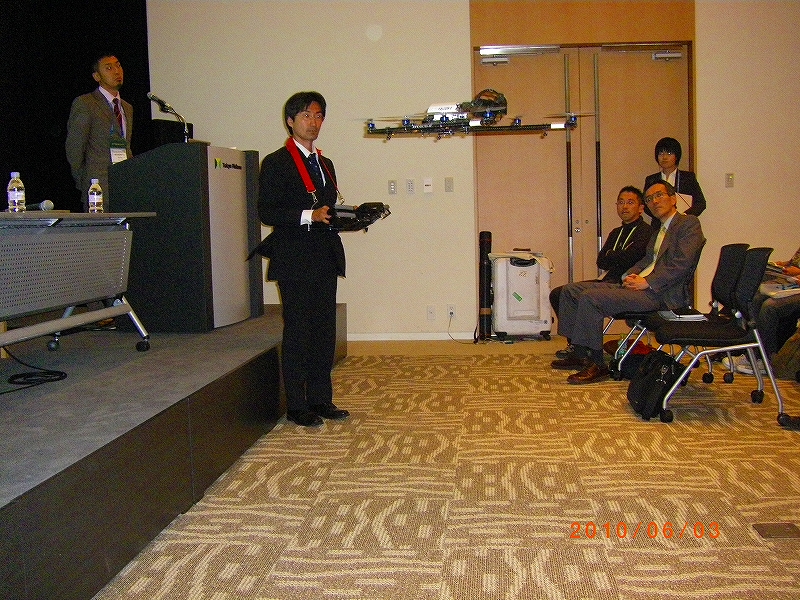 このグループ ミーティングは、環境問題に関心のある有志によって企画されたものです。蓋を開ければ満員御礼で立ち見が出るほどでした。「空から環境を捉える」をテーマに生物多様性の保全とのことで、休耕田の再生にリモートセンシングでモニタリングすることや、小型ラジコンヘリによる高解像度画像の撮影(発着の実演つき!)、ALOSのレーダ画像を用いて雨季のアマゾンの違法伐採を観測する発表がありました。またArcGIS10では画像処理の機能を拡張しており、ESRIジャパン社員によるLandsat画像によるNDVIの経年変化を見せる発表もありました。