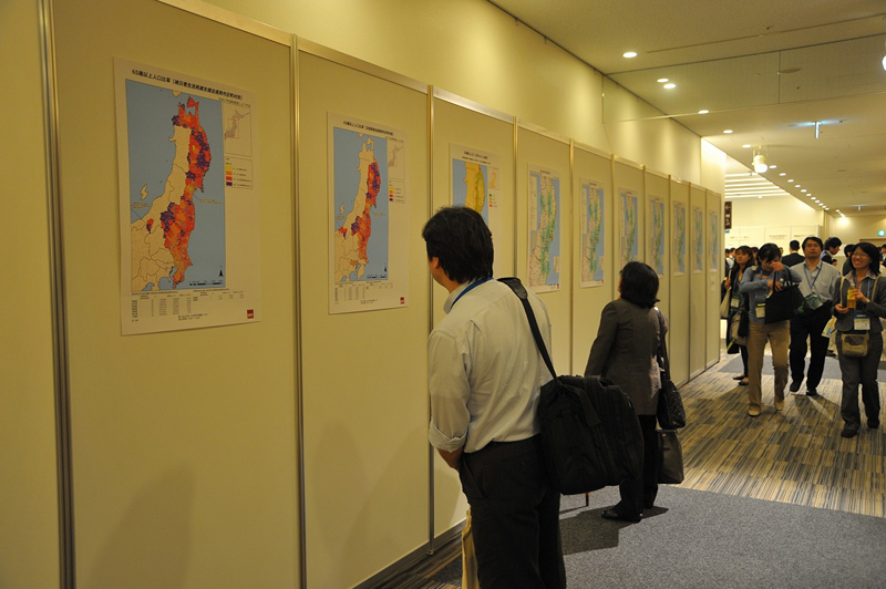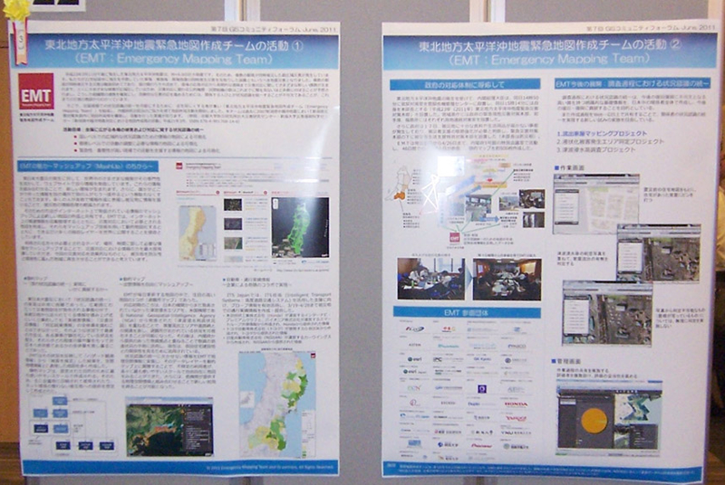 東北地方太平洋沖地震 緊急地図作成チーム(Emergency Mapping Team)が作成した、多様なマップの一部を通路に展示しました。会場の通路全面にマップが展示され、来場者の注目を集めていました。