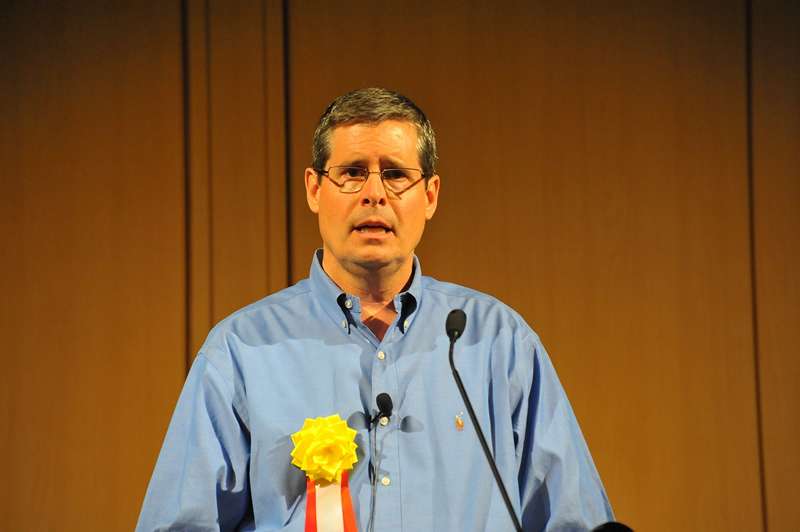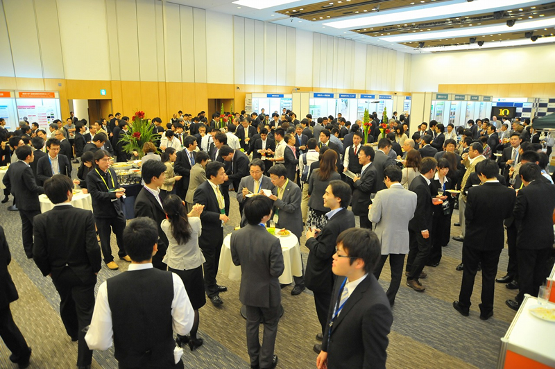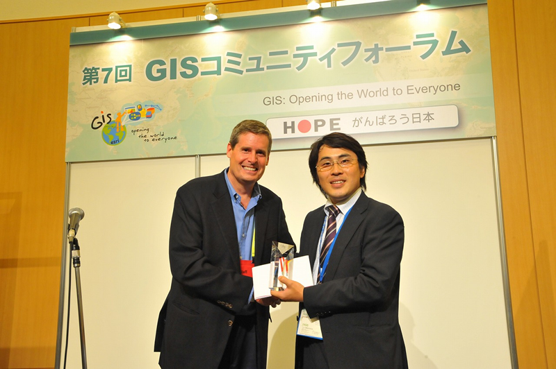 東京工業大学 斎藤元也先生からご挨拶と乾杯をいただき、懇親会が始まりました。東京ミッドタウン周辺の天気は、あいにくの雨でしたが、参加者は200人を超え、各展示コーナーでは人の輪ができました。和んだ雰囲気の中、GIS利活用の在り方など白熱した議論もあちらこちらで交わされ、GISコミュニティの着実な広がりを感じた瞬間でした。恒例のマップギャラリーでは上位5位までの発表と表彰式も行われ、大きな拍手とともに受賞者の喜びの声もお聞きすることができました。