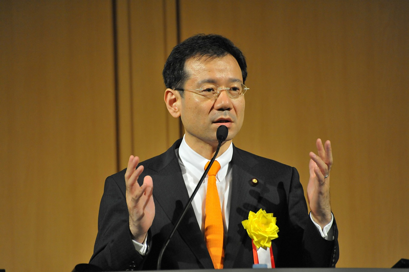 教育GISフォーラム発起人の一人であり、通産省で情報教育の担当としてGISは教育現場におけるキラーコンテンツのひとつであると15年前から痛感していたと自己紹介されました。その後、副大臣就任まで慶應義塾大学で情報教育の教鞭を取り、GISもカリキュラムに取り入れられ、「インフラや関連技術の進歩によりGISをもっと広く教育現場に迎える環境はできている。この度の震災を機に、特に東北三県では空間的な認知構造を備えた人材の育成をパイロット的に行いたい。」と述べられました。文科省が推奨する“学びのイノベーション”において、GISは中核的な役割を持つキラーコンテンツであることを解説されました。現代の子供たちには、物事を表層的に、刹那的にとらえる傾向がある。GISを教育に取り入れる事は、単に地理学習が進歩するだけではなく、3次元、そして時間を含めた4次元で物事を把握する能力を備えた子供たちを育成する事になる。このような時空を超えて立体的に物事を理解する子供を育てられれば劇的に社会が変わっていくと考えており、GISは新しい認知構造を獲得した児童、生徒、学生を育成するための中核的なツールであると解説されました。また、GISのみならず、学校教育の情報化に関し、デジタル教材の開発が望まれると述べられました。現状の教科書のようなリニアな教材でなく、ゲームのように、環境が時空間環境としてできあがっている教材を整えるべきではないかと述べられました。最後に、教員の情熱、コンテンツ、そして環境を整える事により空間情報編集力を備えた国民・人材を育成したいと述べられました。