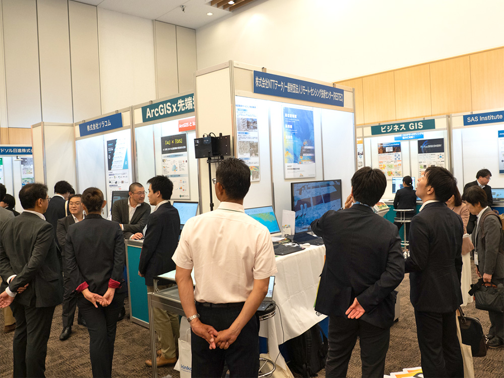スポンサー展示全 20 社による様々な ArcGIS 関連ソリューション、GIS データ等の紹介が行われました。参加者はそれぞれ興味のあるブースでの情報収集を行っておられました。