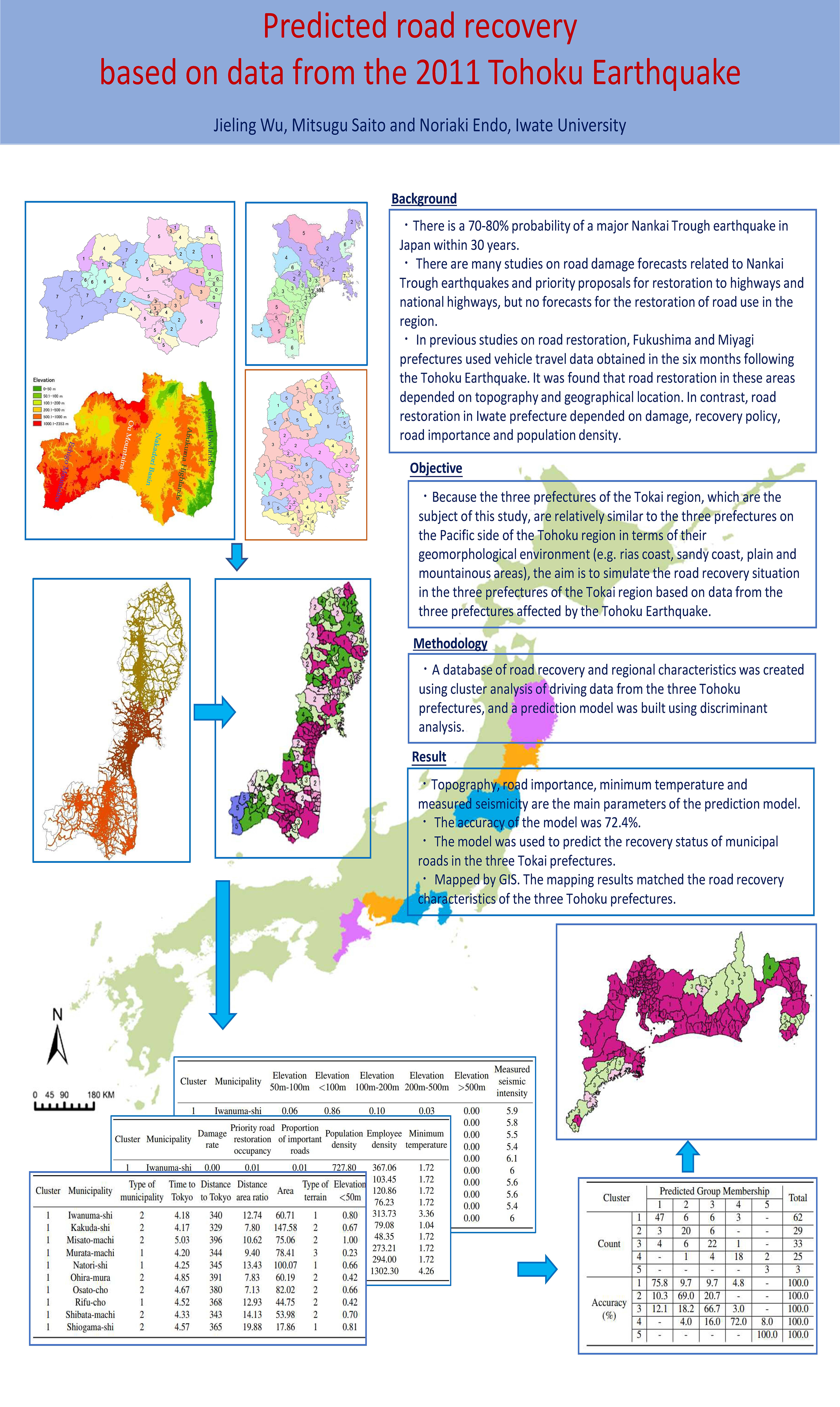 日本では、30 年以内に 70~80% の確率で南海トラフ巨大地震が発生すると言われる。南海トラフ地震に関する道路被害予測、高速道路や国道に復旧優先提案の研究が多い、地域の道路利用回復の予測はない。本研究の対象とする東海地方 3 県が、東北地方太平洋側3県と地形環境(リアス式海岸、砂浜海岸、平野・山地部など)の立地が比較的似ているから、東日本大震災の被災 3 県のデータを基にした東海地方 3 県の道路回復状況をシミュレートするとを目的とした。東北 3 県の走行データをクラスター分析し、道路復旧状況と地域特性をデータベース化し、判別分析により予測モデルを構築した。研究結果には、地形、道路の重要度、最低気温、計測地震動が予測モデルの主要なパラメータとなった。また、モデルの精度は 72.4% であった。このモデルを用いて東海 3 県の市町村道の復旧状況を予測し、予測結果を GIS でマッピング結果は、東北 3 県の道路復旧特性と一致した。