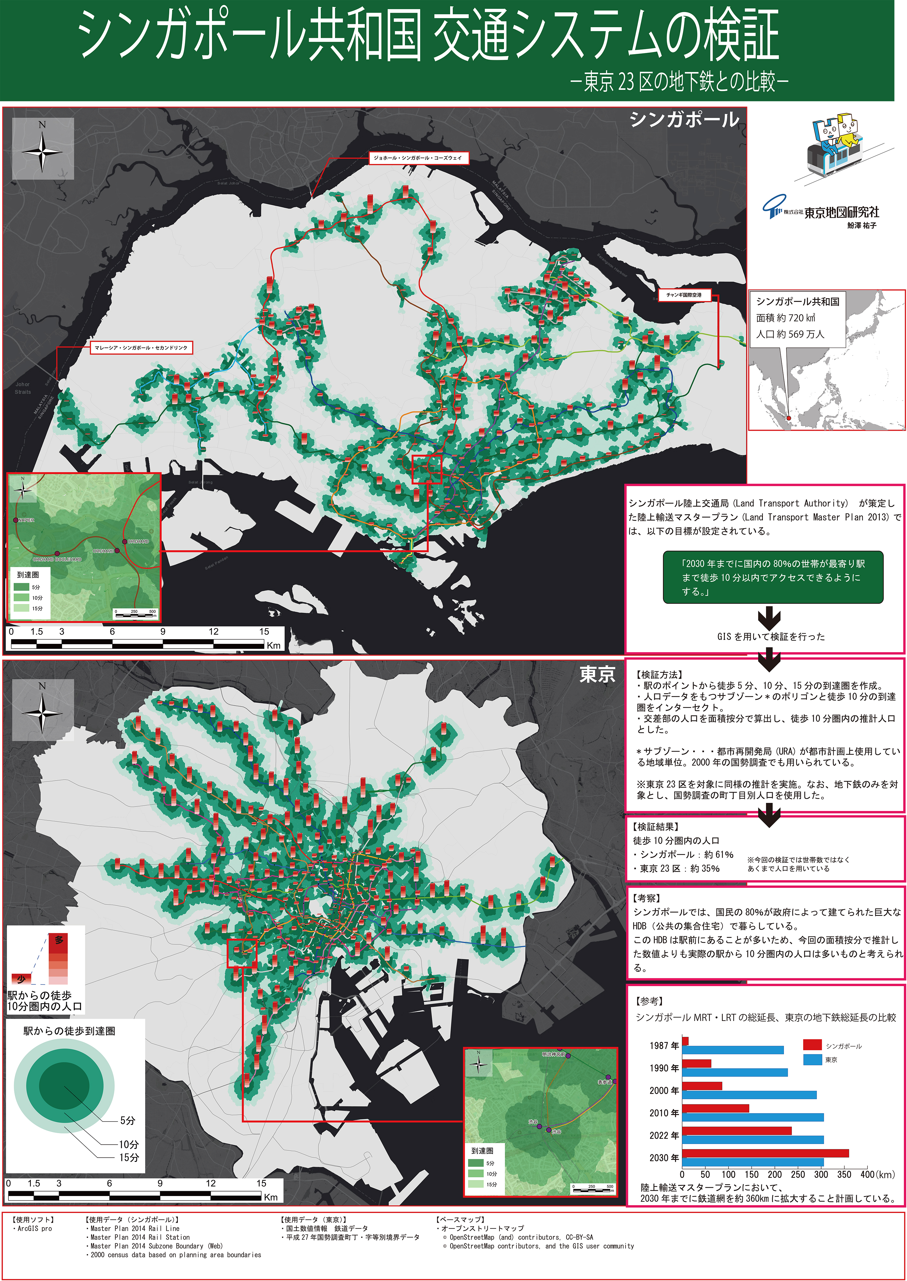 MRT/LRT の既存駅と 2030 年までにできる新駅をプロットし、駅から徒歩 10 分圏内の範囲を可視化するとともに、そこに居住している人口を推計し、東京 23 区の地下鉄との比較も行った。