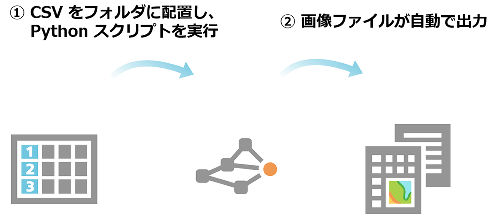 所定の場所に CSV ファイルを配置して、Python スクリプトを実行するだけで、画像ファイルが自動で出力されます。従来の手順で必要だった一連の流れも一括処理できます。