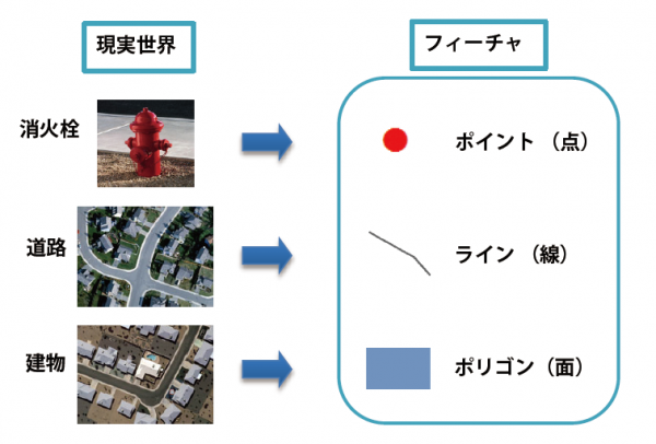 ArcGIS では、現実世界にある消火栓や道路、建物などをベクター データ化した個々の地物をフィーチャと呼びます。