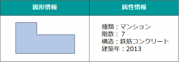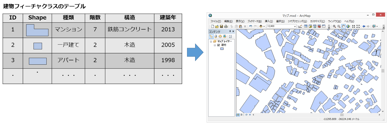 フィーチャは図形情報と属性情報で構成されます。たとえば、建物のフィーチャの場合、ある建物の図形情報(建物の形状)とその建物の特徴(鉄筋コンクリート、7 階建てなど)を表す属性が対となって 1 つのフィーチャとして表現されます。