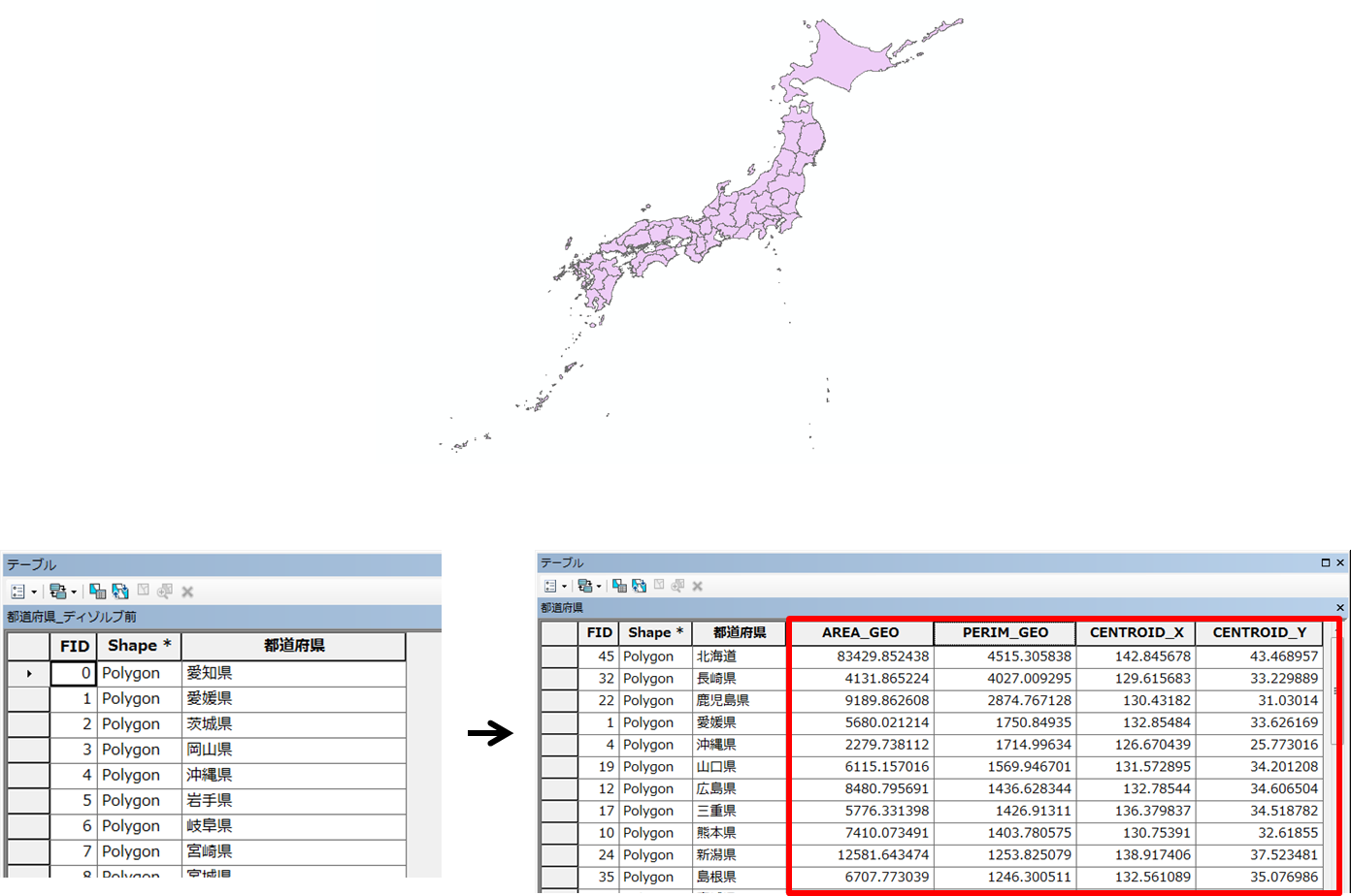 また、都道府県のポリゴン データに対し「ジオメトリ属性の追加」というジオプロセシング ツールを実行すると、下の図のように属性テーブルに外周の長さ、面積、重心の X、Y 座標値の情報を一括で追加することができます。