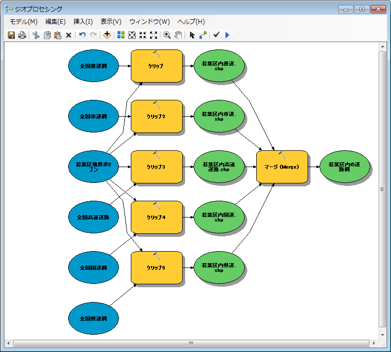 同じ処理を繰り返したり、さまざまなジオプロセシング ツールを組み合わせたりして複雑な処理を行う場合に、ジオプロセシング ツールの実行を簡略化することができる ModelBuilder があります。下の図に示すように、複数のジオプロセシング ツールと必要なデータを設定し、全体のワーク フローを作成してから一気に処理を実行することができます。作成した ModelBuilder を保存し、データを差し替えて実行処理を再利用することも可能です。また、プログラミング言語の一種である Python を使用し、オリジナルのジオプロセシング ツールを作成したり、処理を自動化したりすることもできます。