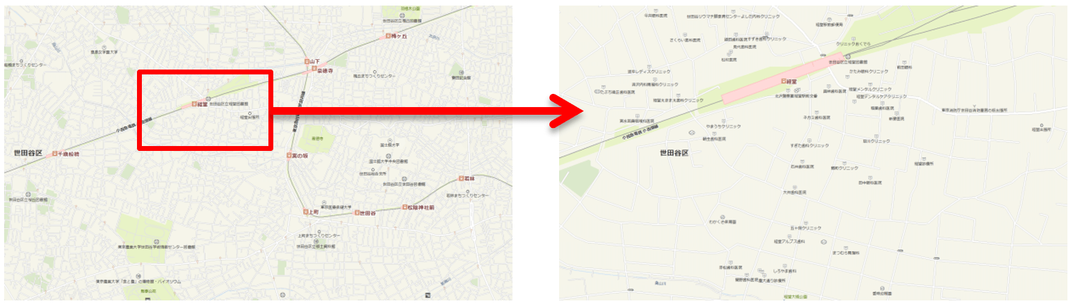 「地図」において、無くてはならない重要な要素の 1 つとして、道路名や交差点名、駅名や河川名、地名や建物名など、地物の名称情報があります。仮に地図上に名称が表記されていなければ、それがどこの場所の地図なのか理解することは非常に困難でしょう(下図、左のマップ)。一方、適切に情報が表記されていれば、格段にわかりやすい地図になります(下図、右のマップ)。ArcGIS では地図上のさまざまな情報を自由に表示したり、設定したりすることで、よりわかりやすい地図を作成することが可能です。