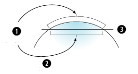 下の図で表現されている通り、[1] の部分で示された曲面(地球表面)を [2] の部分で示された平面(紙地図などの 2 次元で表現される地図)に変換することを考えます([3] を投影面と呼びます)。この [1] を [2] に変換する作業にあたり、極(中心)と両端部分については同じ位置で表現することができますが、その中間にあたる曲面は投影することにより実際の距離より小さく表現する必要があります。その際に実際の地球表面と 2 次元地図の違いによる歪みが発生することになります。