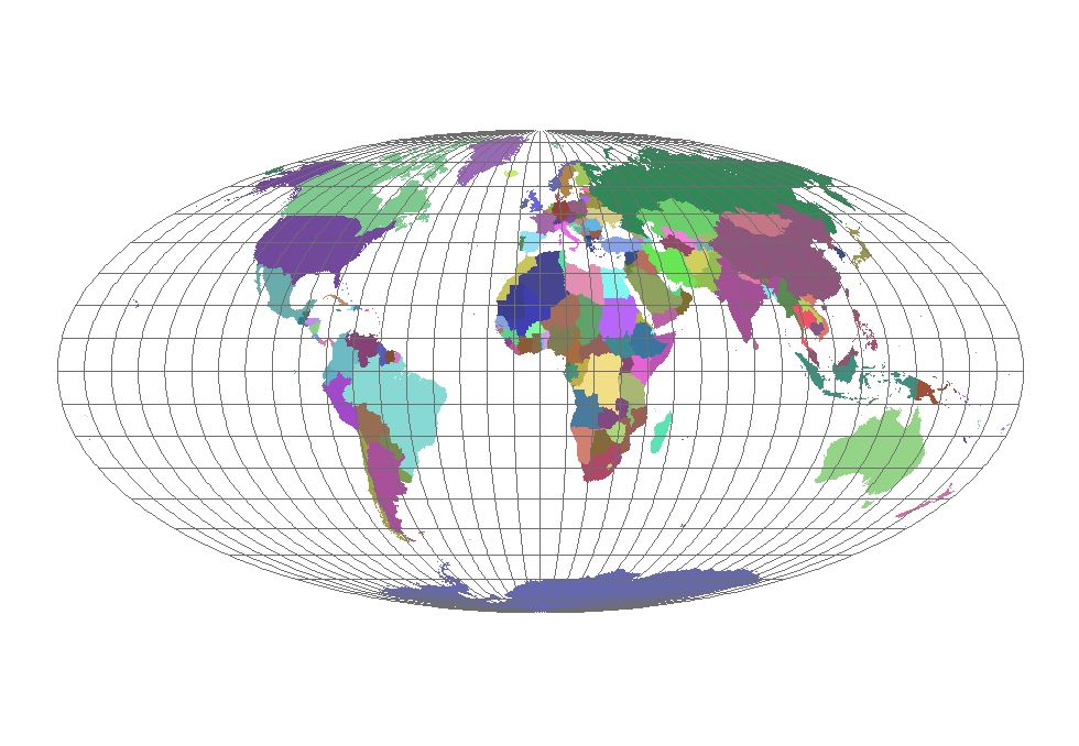 例えばモルワイデ図法では、面積は正しく表現されますが形状において歪みが発生しています。