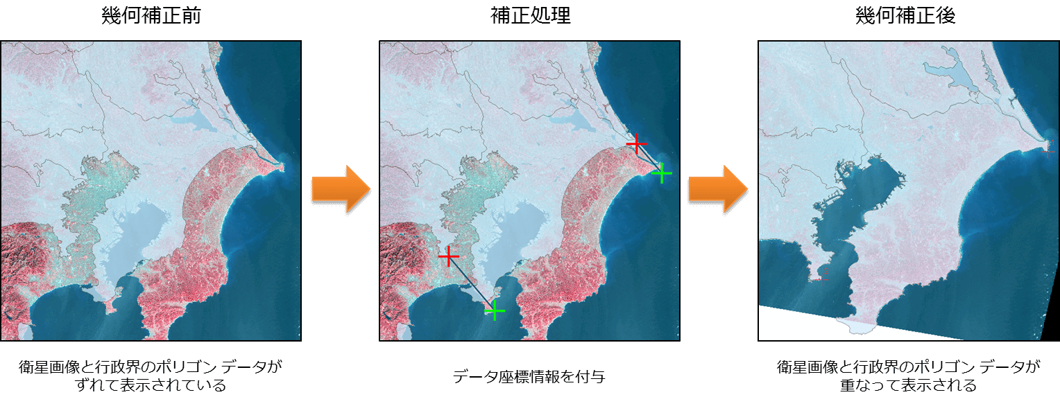 このような GIS データの位置合わせを行う処理を幾何補正と呼んでいます。