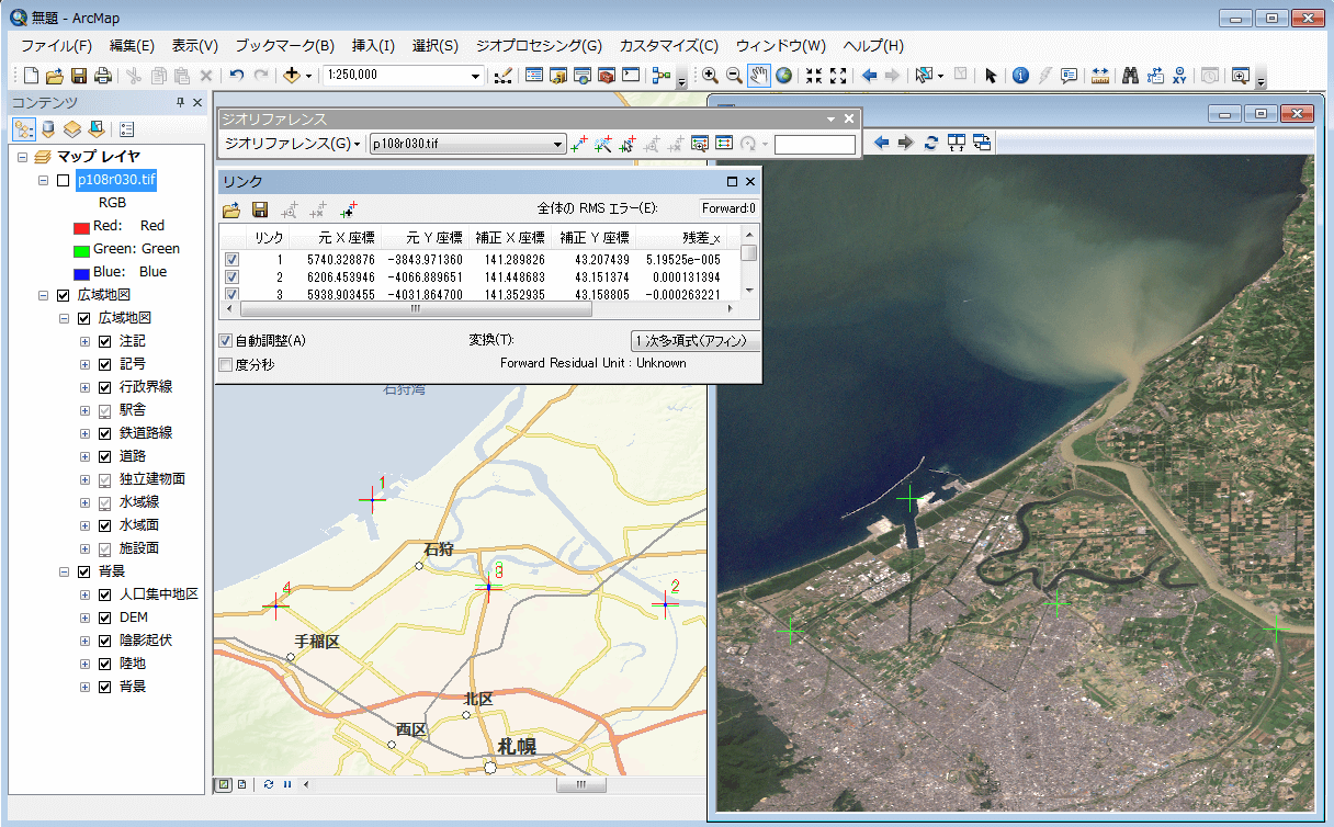 データとデータの共通の重なり地点などを指定し、ラスター データの位置を補正します。単純にデータの移動やサイズ変更を行う以外にも、データを湾曲させ、より正確な補正を実行するための座標変換式が用意されています。