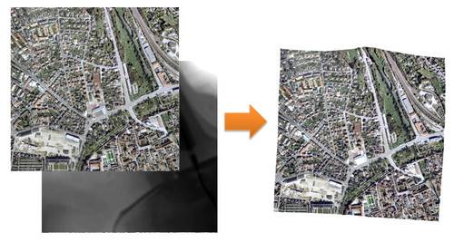 衛星画像や航空写真には、センサーの特性や地形による歪みなどが原因による地理的な誤差が存在します。オルソ幾何補正では、標高データを併せて使い、地形による歪みなどを考慮してラスターデータを補正します。