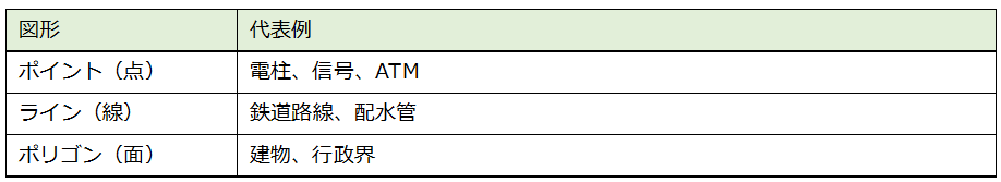 の3つの要素で表現したものです。それぞれが座標と属性情報を持っており、地図上で表現できます。ポイント(点)データは、図形情報を(x, y)の座標値で格納します。ライン(線)データは、(x, y)の座標値を結んだ線分として格納します。ポリゴン(面)データは、(x, y)の座標値を結んだ閉じた線分として格納します。格納される座標値は、緯度・経度、あるいは地図投影法により定義された値です。