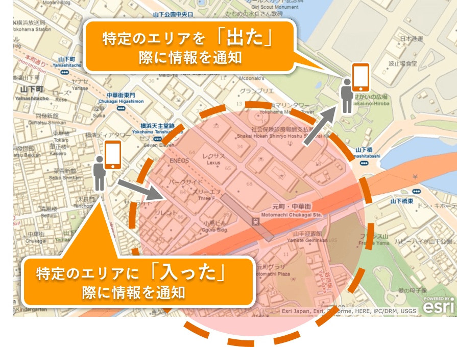 ジオフェンスとは、仮想的な境界線で囲まれたエリアを表します。ジオフェンスは、このエリアに対象が「入った / 出た」を判断するために利用できます。自店舗周辺のエリアをジオフェンスとして設定し、顧客等が所有するスマートフォンなどで取得できる位置情報を利用することで、自店舗の近くを顧客が通ったときにクーポンなどをメールで送信するような活用が可能です。