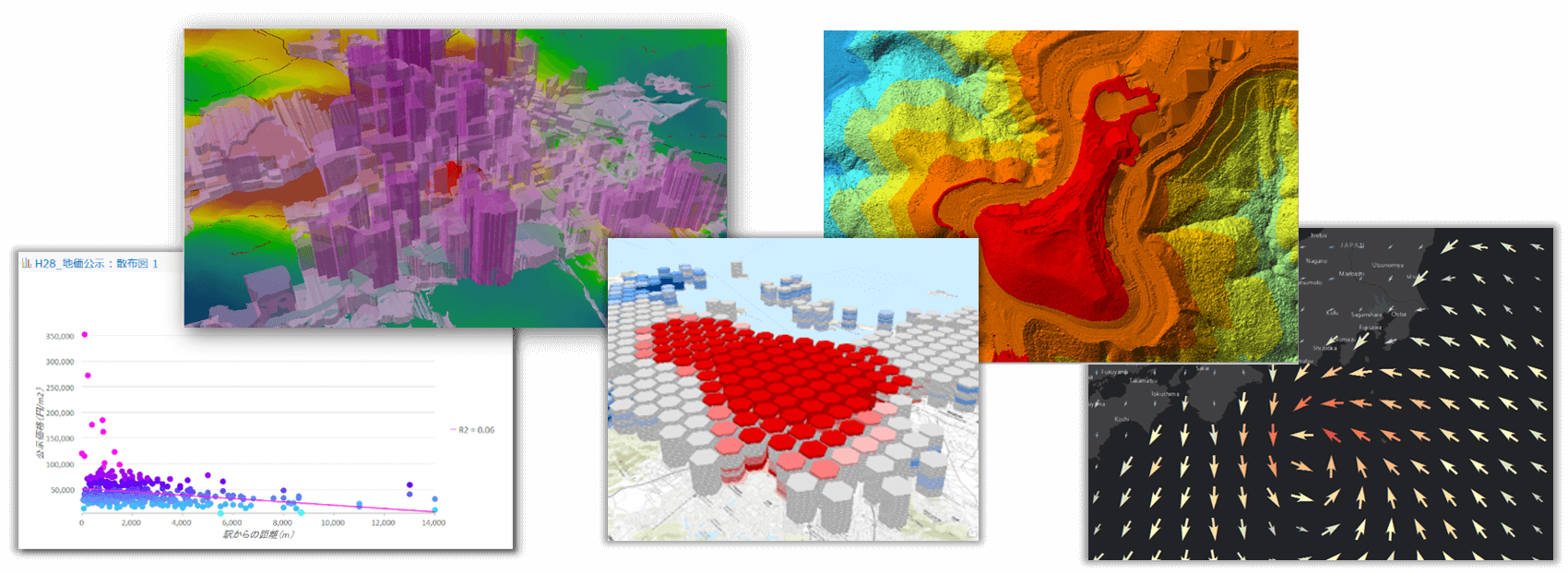 地図によるデータの可視化を、インフォグラフィックスを作成する方法の 1 つと考えるならば、ArcGIS のさまざまな機能を活用して多彩なインフォグラフィックスを作ることができます。2D/3D のさまざまな地図表現に加え、地図と連動した多彩なチャートによるデータ表現も可能です。また時系列データのアニメーション表示などの機能も利用することができます。
