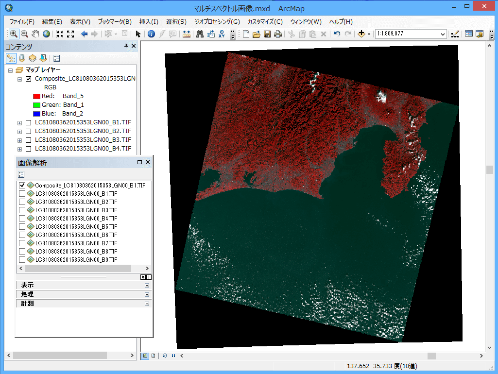 上記で紹介した NDVI の算出は、ArcGIS for Desktop の [画像解析] ウィンドウで簡単に実行することができます。また、NDVI 以外のバンド間演算、その他マルチスペクトル画像を活用した分析に関しては、ArcGIS Spatial Analyst エクステンションが提供する各解析のジオプロセシング ツールで実行することができます。