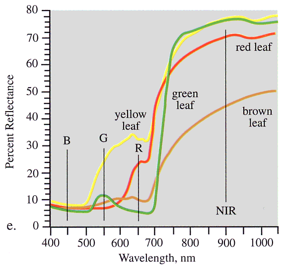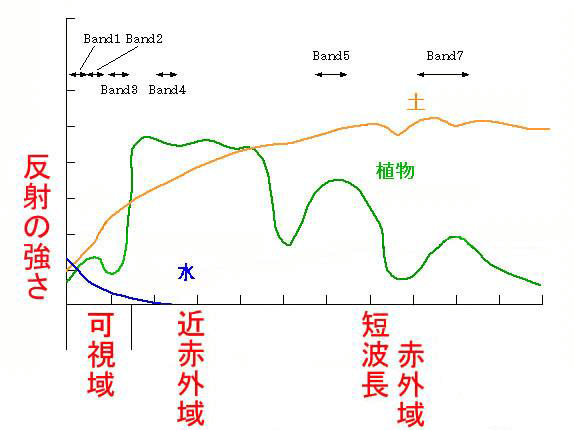 地表の物体は、種類によって波長帯ごとに電磁波の反射の強さが変化します。これを、スペクトル反射特性と呼びます。たとえば、「水」は波長が長くなるにつれ反射が弱くなり、「土」は波長が長くなるにつれ反射が強くなる傾向があります。また「植物」は、光合成色素の働きで可視域の電磁波を吸収(反射が弱くなる)し、近赤外域の電磁波を強く反射する特性を持っています。