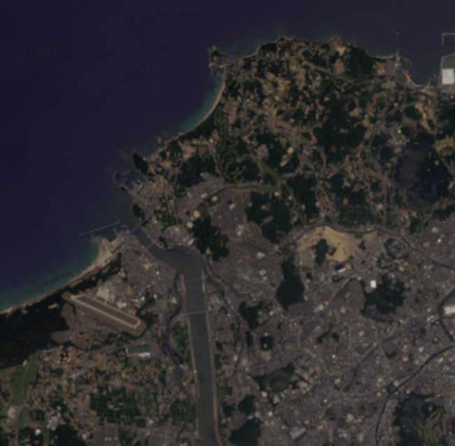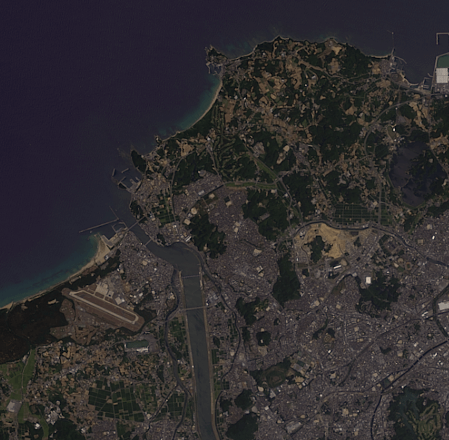 この 2 つの画像を合成することで、高解像度のマルチスペクトル画像を作成することができます。パンシャープンとは、高解像度パンクロマティック画像と低解像度のマルチスペクトル画像の 2 つを合成する処理のことです。パンシャープンによって得られた合成画像は、パンシャープン画像と呼ばれます。パンシャープン画像は地物の目視判読や背景画像などに利用できます。