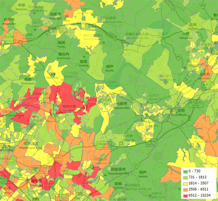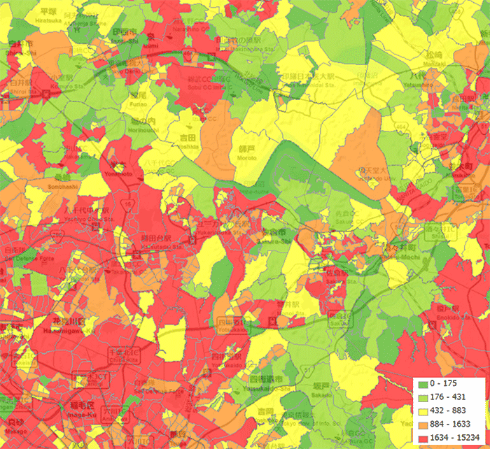 量を表すデータ(すなわち数値データ)を表現する代表的な方法として、数値情報を段階的に区分して色分け表示する方法があります。その方法には等間隔(属性値の範囲を等間隔で分類)や等量(各段階のデータ数が同じになるよう分類)、自然分類(値が類似しているグループで分類)、標準偏差(データの平均値からの標準偏差で分類)などがあり、複数の配色を用いて表示することができます。