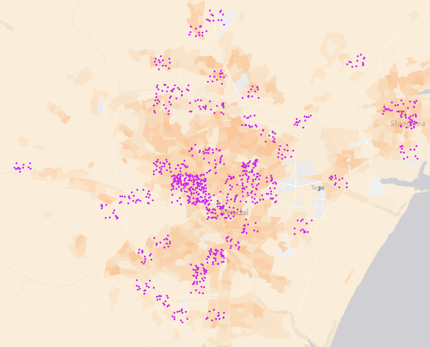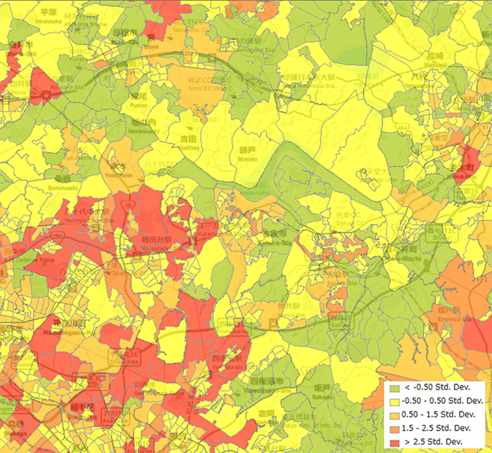 主題図とは、たとえば「出店候補地の分析」や「土地利用の変遷」といったテーマに対して、必要な主題データを利用して分析した結果や、複数の主題データを重ね合せて表現した地図です。