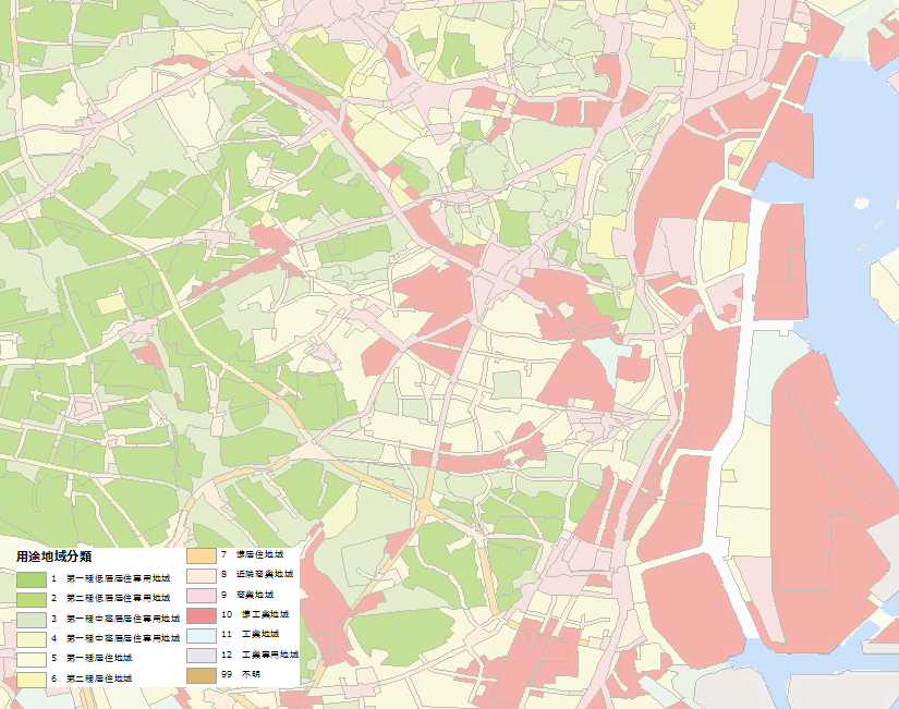 特定の主題を持たないデータは、単色で表現しますが、用途地域などの性質で分類されるポリゴン データは、その性質ごと(商業地域、工業地域など)に色を割り当てることでわかりやすく表現することができます。
