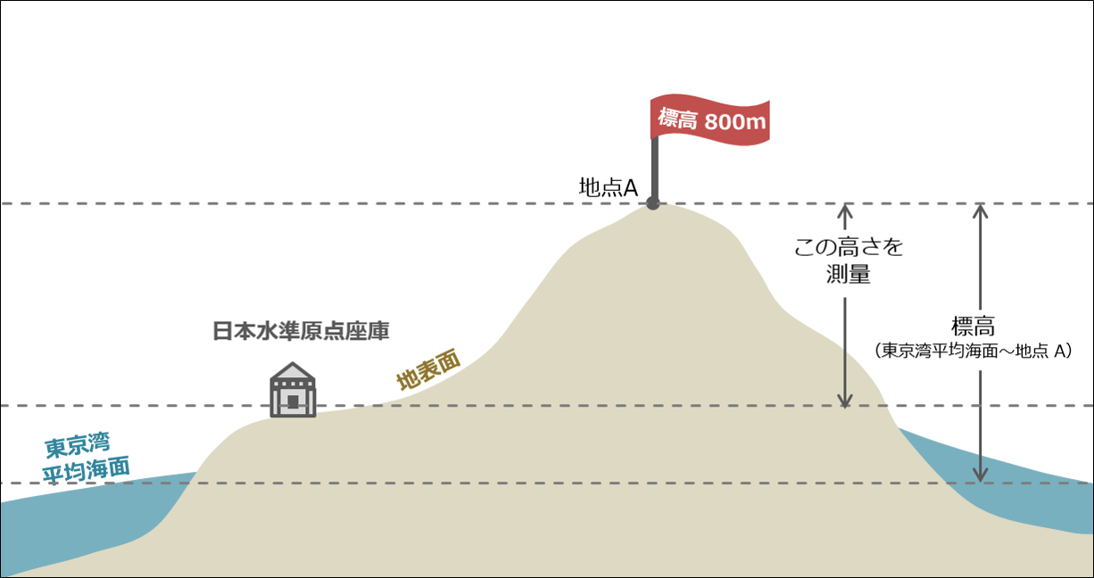 一般的に地理において、標高はある特定の地点を基準とした高さのことを指します。日本ではこの基準を東京湾の平均海面(標高 0m)と定義していますが、海面は波があり固定されていないため、実際には東京都千代田区永田町の国会前庭洋式庭園内にある日本水準原点標庫からの高さを基準に測量して標高を求めています。