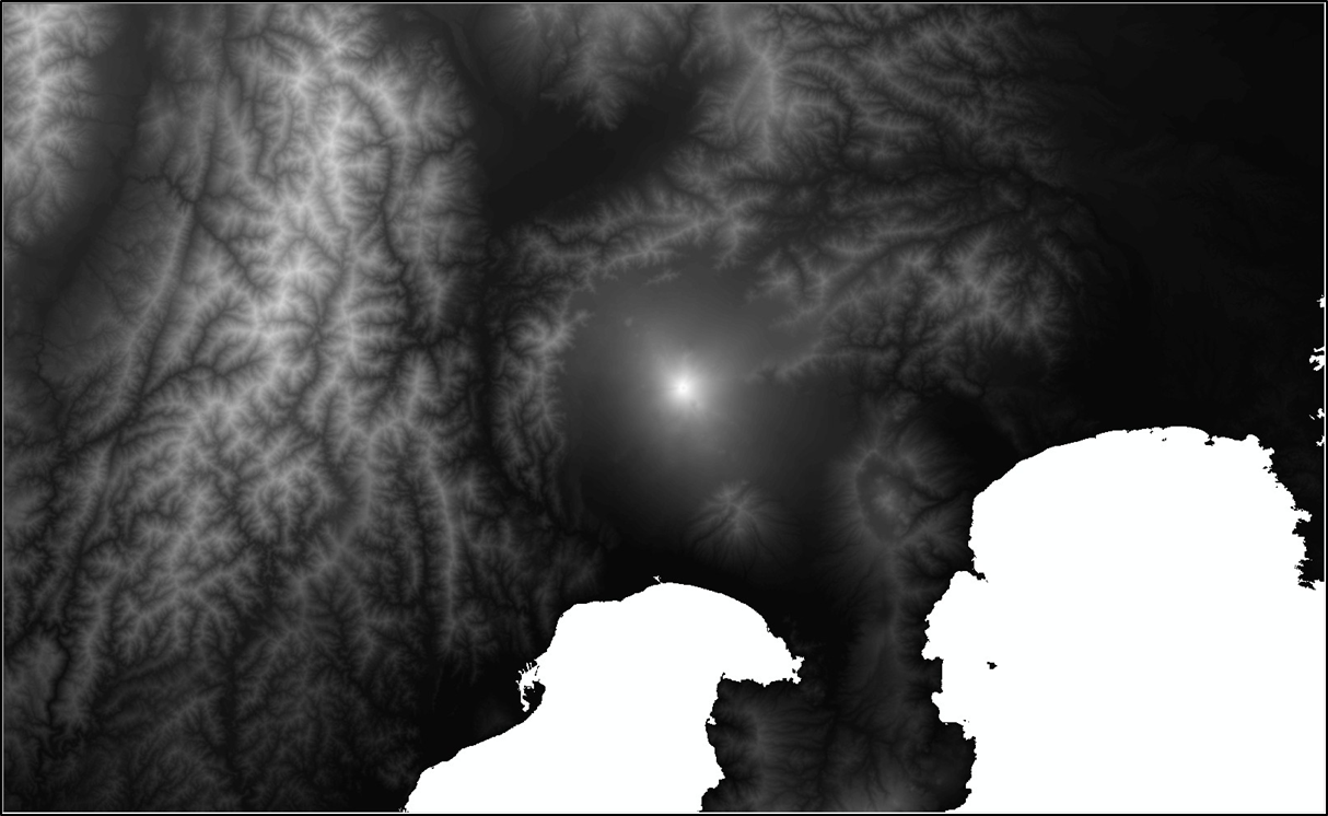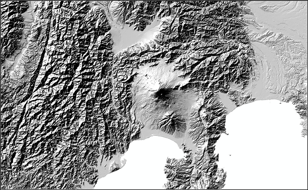 陰影起伏図とは、ある方向から光を当てたときに地表面に生じる陰影を再現したもので、地形の起伏を立体的に表現したい場合などの利用に適しています。ArcGIS では DEM などから簡単に陰影起伏図を作成することができます。