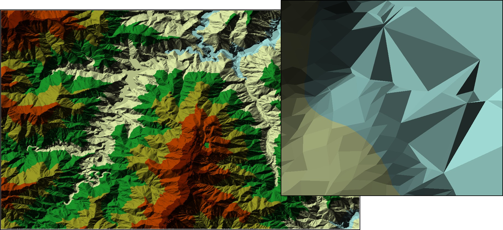 標高のデータモデルの中で、DEM、DTM、DSM とデータの格納方法が大きく異なるのが TIN(不規則三角形網)です。TIN はベクター データ形式の標高の表示方法で、等高線(後述)や DEM などの標高データの頂点(ポイント)のセットを結んでできる不規則な三角形によって構成されています。これらの三角形は地形が平坦なエリアでは大きく、また、地形の変化が激しいエリアでは小さくなるため、地形状態の変化(たとえば、山頂や斜面の末端、尾根、谷底、くぼ地など)を特定したい場合などに活用できます。ArcGIS では ArcGIS 3D Analyst を使用して等高線や DEM データから TIN を作成することが可能です。