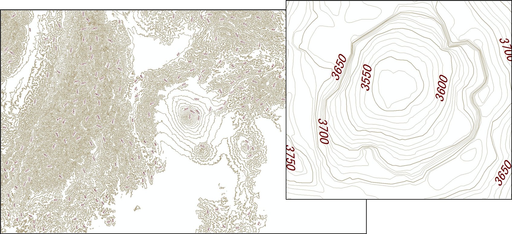 一般的にもよく知られている標高の表現方法に等高線があります。等高線は標高が等しい点の集まりを結んだ線のことを指し、5m、10m、50m などの一定の間隔で連なって表されます。GIS においては、一般的にベクター データ(ラインまたはポリゴン)で等高線を作成します。等高線で標高を表現することで、たとえば等高線の幅が広いほど傾斜がなだらかというように、地形の傾斜を読み解くことができます。国土地理院「数値地図(国土基本情報)」などからあらかじめ等高線として提供されているデータを利用する以外に、ArcGIS では DEM などから等高線を作成することも可能です。