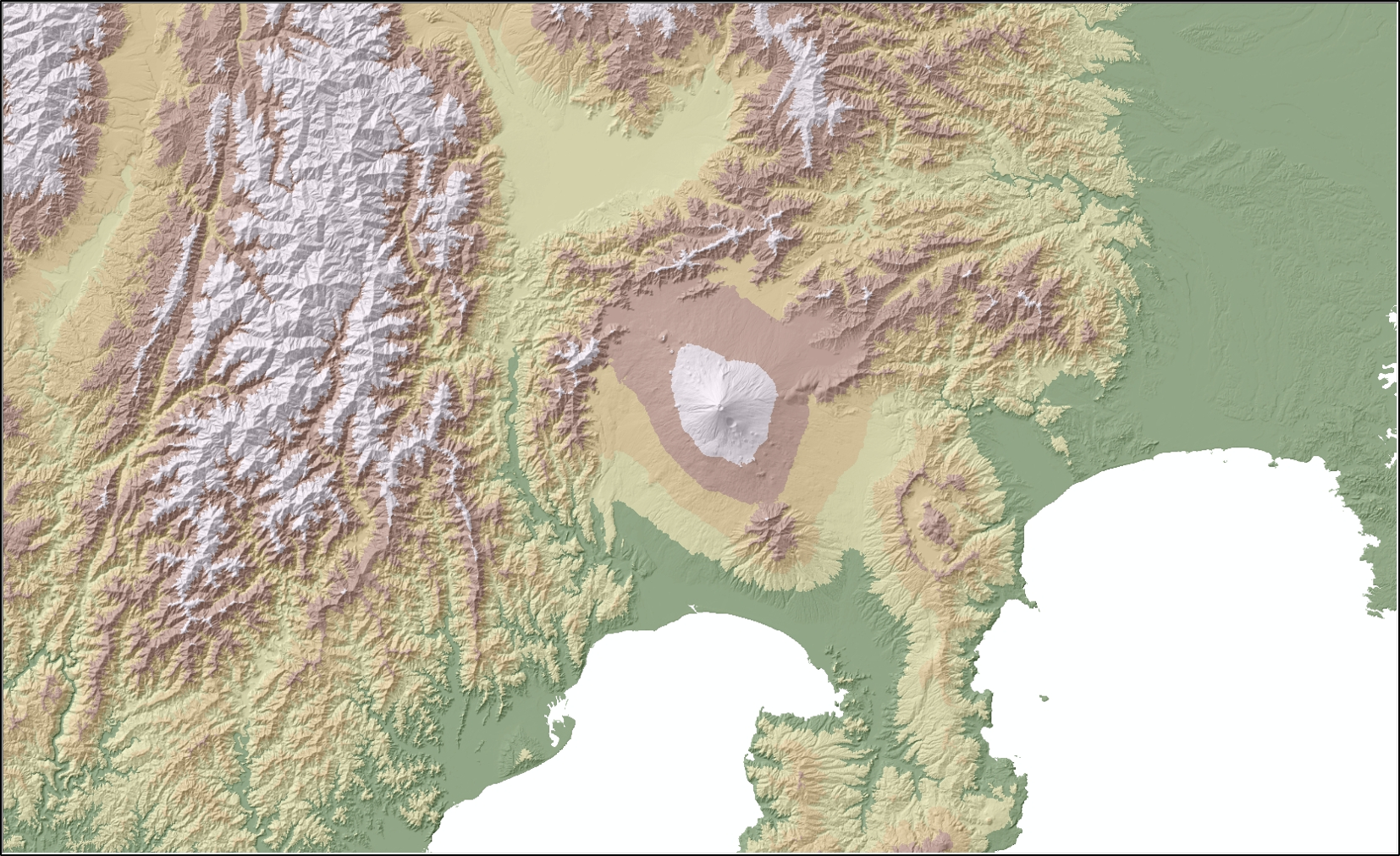 高度段彩図とは、標高値を高度の段階ごとに分け、その段階ごとに色付けを行う表現方法です。色を付けることで、より直感的に地形の高低やその間隔を把握できるようになります。高度段彩図と前述の陰影起伏図を重ねてさらに見やすくしたものを陰影段彩図と呼びます。