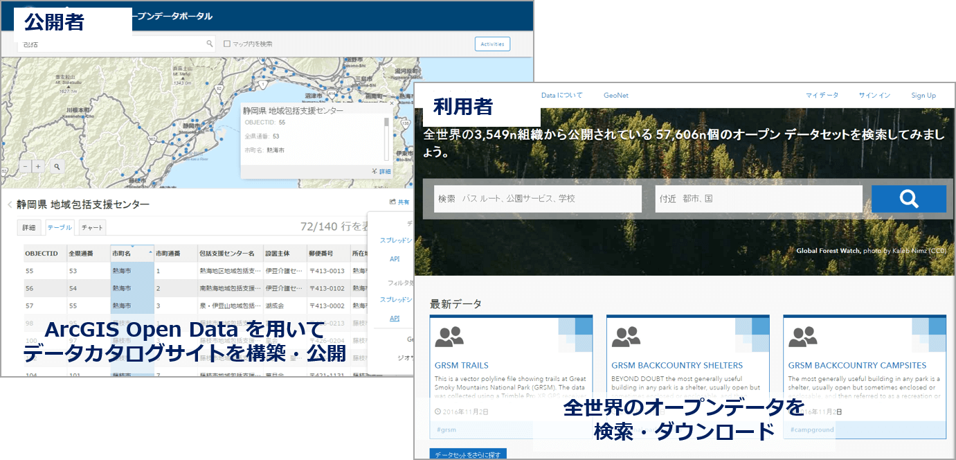 室蘭市や流山市のような GIS 機能と組み合わせたデータカタログサイトは、利用者のデータへの理解を直感的でわかりやすくし、データの利活用を促進することができます。そこで ESRIジャパンでは、データカタログサイト構築キットとして「ArcGIS Open Data」を提供しています。本キットは、ArcGIS Online の標準付属ツールとして提供しており、公開者は簡単な設定のみでサイトを構築することが可能です。また、利用者は地図を見ながらデータセットの検索・プレビュー・ダウンロードが可能なことに加え、ArcGIS Online 上でデータが公開されるので、自治体の枠を越えてデータの検索・ダウンロードが行えます(データ検索ページ)。オープンデータの公開・活用にぜひご活用ください。