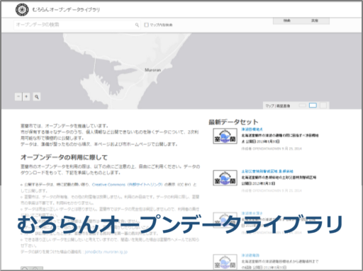 それでは実際にオープンデータの公開・活用例を見てみましょう。最近では、単に緯度経度を含む CSV ファイルやシェープファイルを公開するのではなく、GIS と連携してデータを公開する取り組みも見られるようになりました。室蘭市や流山市では、利用可能なオープンデータがどのようなデータなのかをすぐに地図上で確認できるデータカタログサイトを公開しており、利用者はカタログサイト上でデータを地図に追加し、属性の確認や属性による色分けなどを行うことができます。