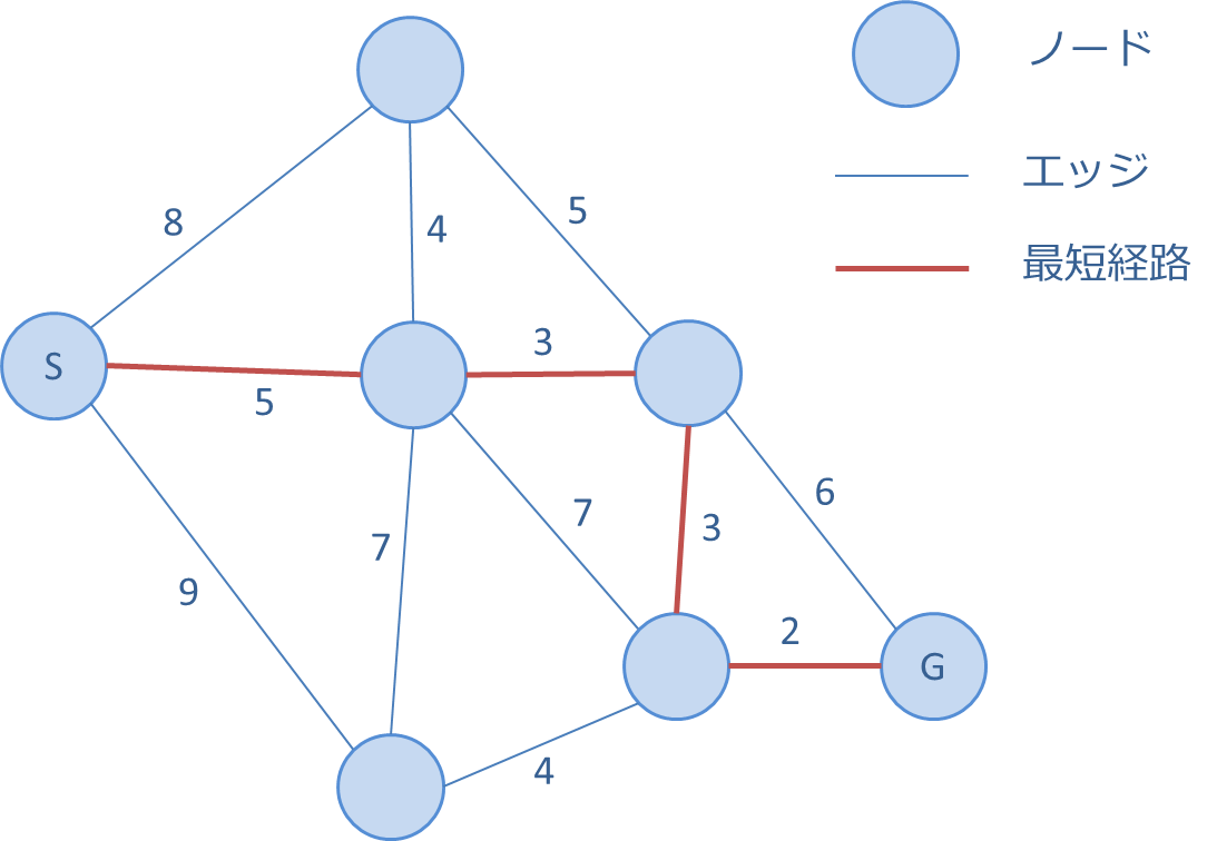 日常的に使用しているこのシステムの裏では、最短経路問題というグラフ理論の問題を解くアルゴリズムにより、計算が行われています。グラフ理論とは、ノードの集合とエッジ(リンクと呼ぶこともある)の集合で構成されるグラフの性質を分析する数学の一分野です。たとえば、鉄道の路線図をグラフで表現すると、ノードが駅でエッジが路線ということになります。グラフ理論を基礎におき、物事をグラフとして抽象化し、そのグラフ構造を分析する手法をネットワーク分析と呼び、社会ネットワーク分析や Web ページの検索システムなど、多くの分野・場面で用いられています。交通ネットワーク解析もその 1 つであり、交差点をノード、道路をエッジとして表現したグラフ構造を分析します。そのため、ArcGIS Network Analyst エクステンションの交通ネットワーク解析においても、ノード、エッジ、リンクといったグラフ理論の用語が用いられています。