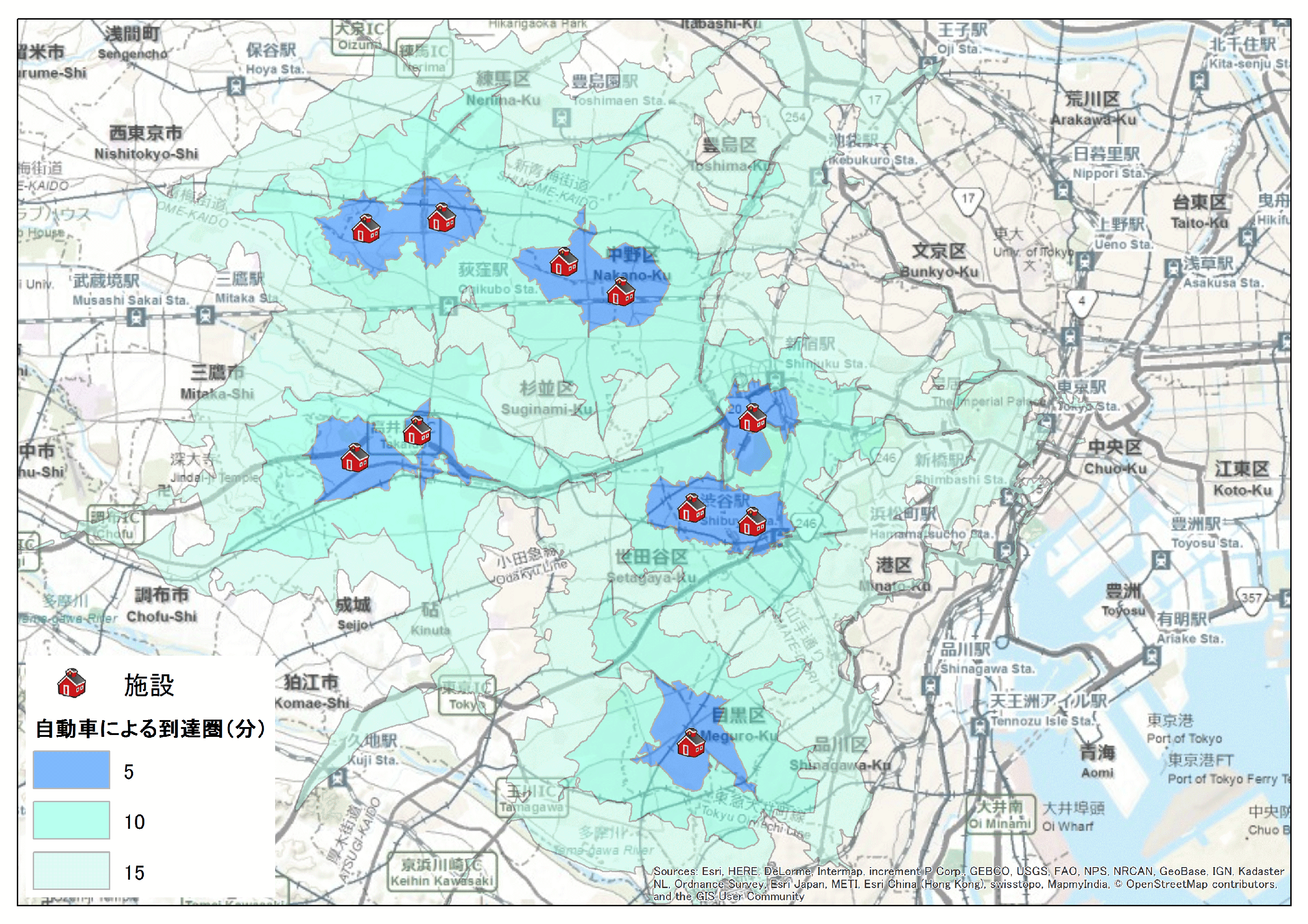 到達圏解析は、ある地点から交通ネットワークを用いた際に、指定した時間内あるいは距離内で到達することができる圏域を算出します。この解析を用いることで、施設へのアクセスのしやすさの評価をより正確に行うことができ、店舗から車で 10 分以内に居住する顧客数の算出や、避難所から 500m 以上離れた場所に居住する住民の人口の集計などに応用することができます。