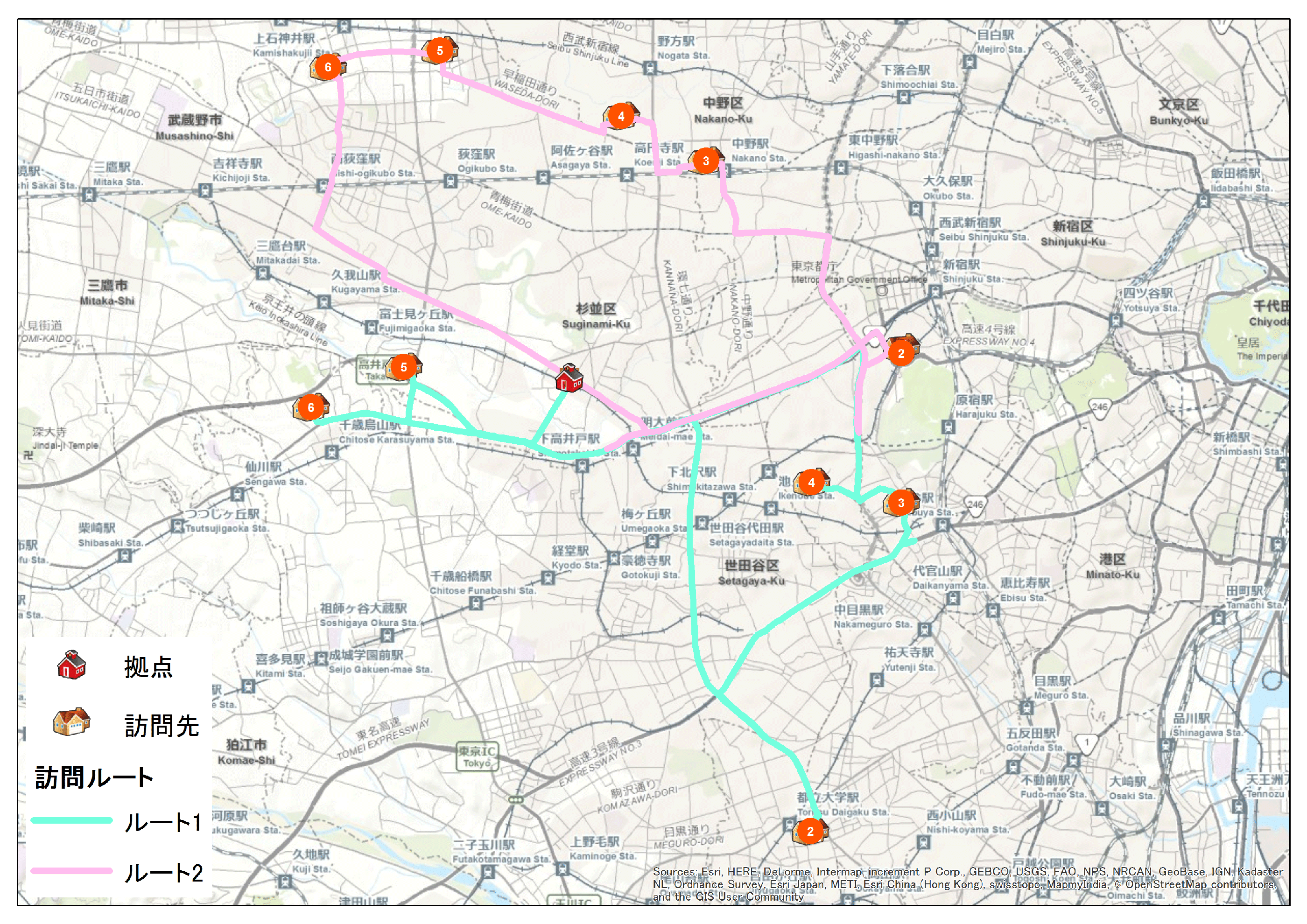 配車ルート解析は、スタート地点からグラフを構成するすべてのノードを経由して再びスタート地点に戻るときの移動コストを最小にする経路を求める巡回セールスマン問題と呼ばれるグラフ理論の問題を、実際の交通ネットワークに応用した解析です。この解析では、拠点から複数の訪問先を巡る際の最適な訪問順とルートを算出します。この解析を用いることで、訪問介護サービスの最適な巡回路の算出や、複数の配送先への適切な車両の割り当てなどに応用することができます。