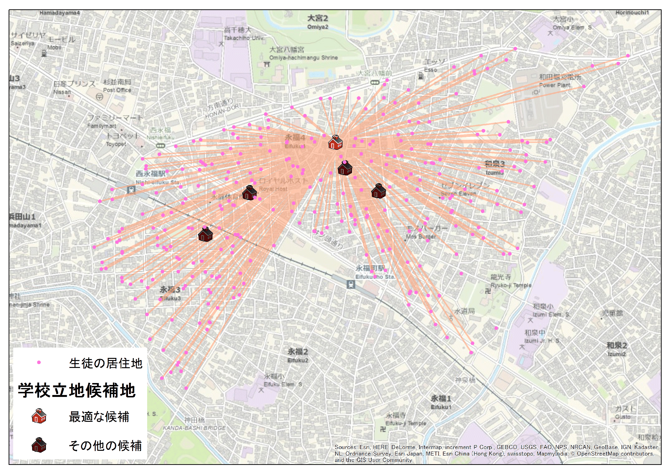 ロケーション-アロケーション解析は、施設の候補地点と需要地点との関係(移動コスト、施設の魅力度、施設の供給能力など)から最適な施設配置を分析します。この解析では、施設がカバーする需要地点を最大にする方法や、施設と需要地点の移動コストを最小にする方法など、いくつかの解析方法が実装されています。この解析を用いることで、施設から 5 分以内にもっとも多くの住宅をカバーできる消防署の立地計画や、生徒の通学距離が最小となる学校の立地計画などに応用することができます。