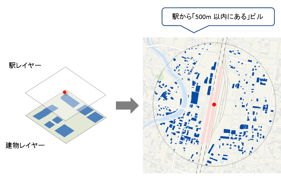 このように多様な関係性に対応するため、GIS にはいくつかの空間検索方法が用意されており、目的に合った方法を選択することで効率的に情報を得ることが可能です。