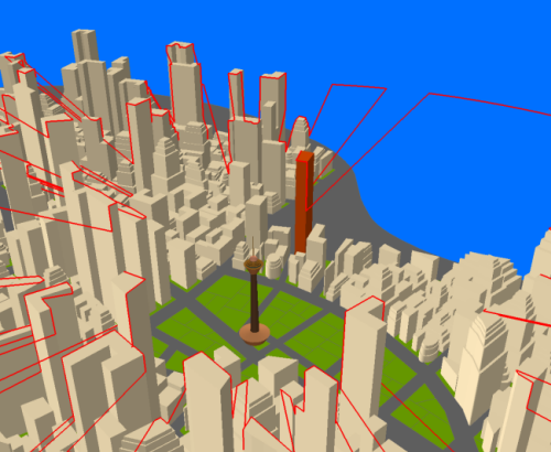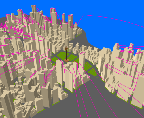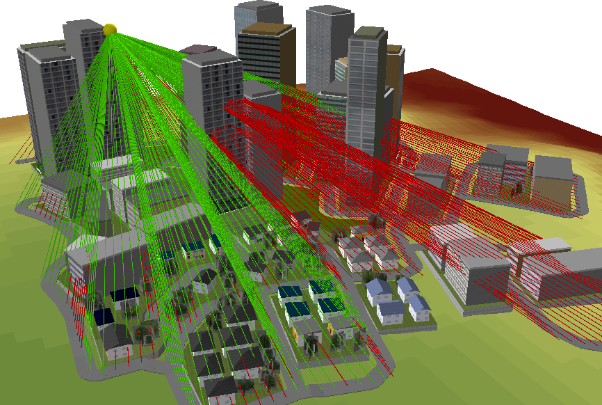 ある地点を結ぶラインの、最初と最後のポイント間の可視性を判断します。以下の図は、左上部にあるビルの最上階に配置した黄色のポイントから道路に対する見通しの可視性を解析した結果です。緑色のラインは黄色のポイントから見通せる箇所、赤色のラインは見通せない箇所です。高層ビルに阻まれている場所は下まで見通せないことがわかります。