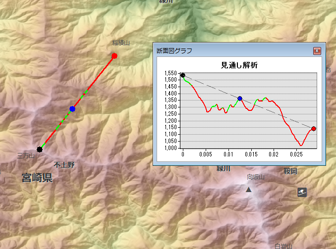 また、見通しの結果から断面図を作成することも可能です。以下の図は、三方山から稲積山までの見通し解析の結果を断面図にしたものです。