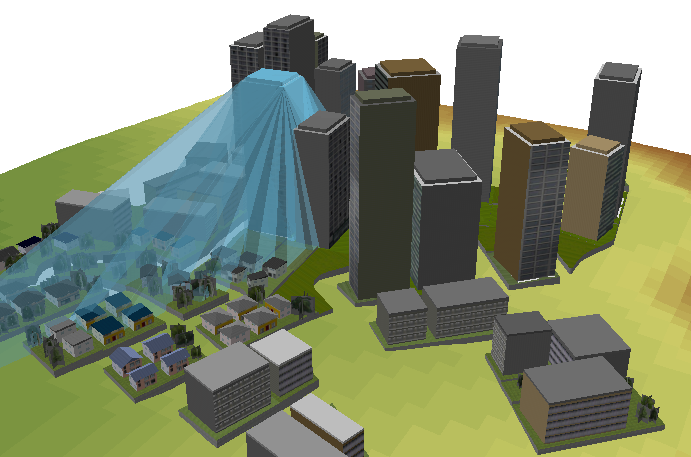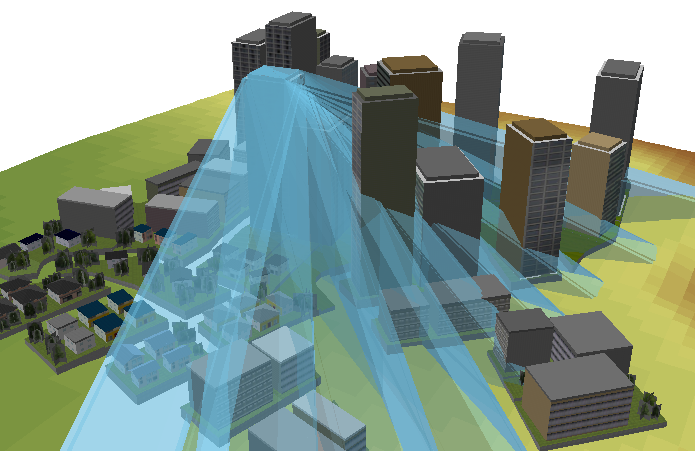 ある観測点から見ることができる天空の広さや、特定の視点で障害物となり得るものを確認するなど、都市空間や建物に囲まれた空間を解析することができます。たとえば、ビルを新たに建設する際に、そのビルによって生じる周辺地域への影響をみることができます。