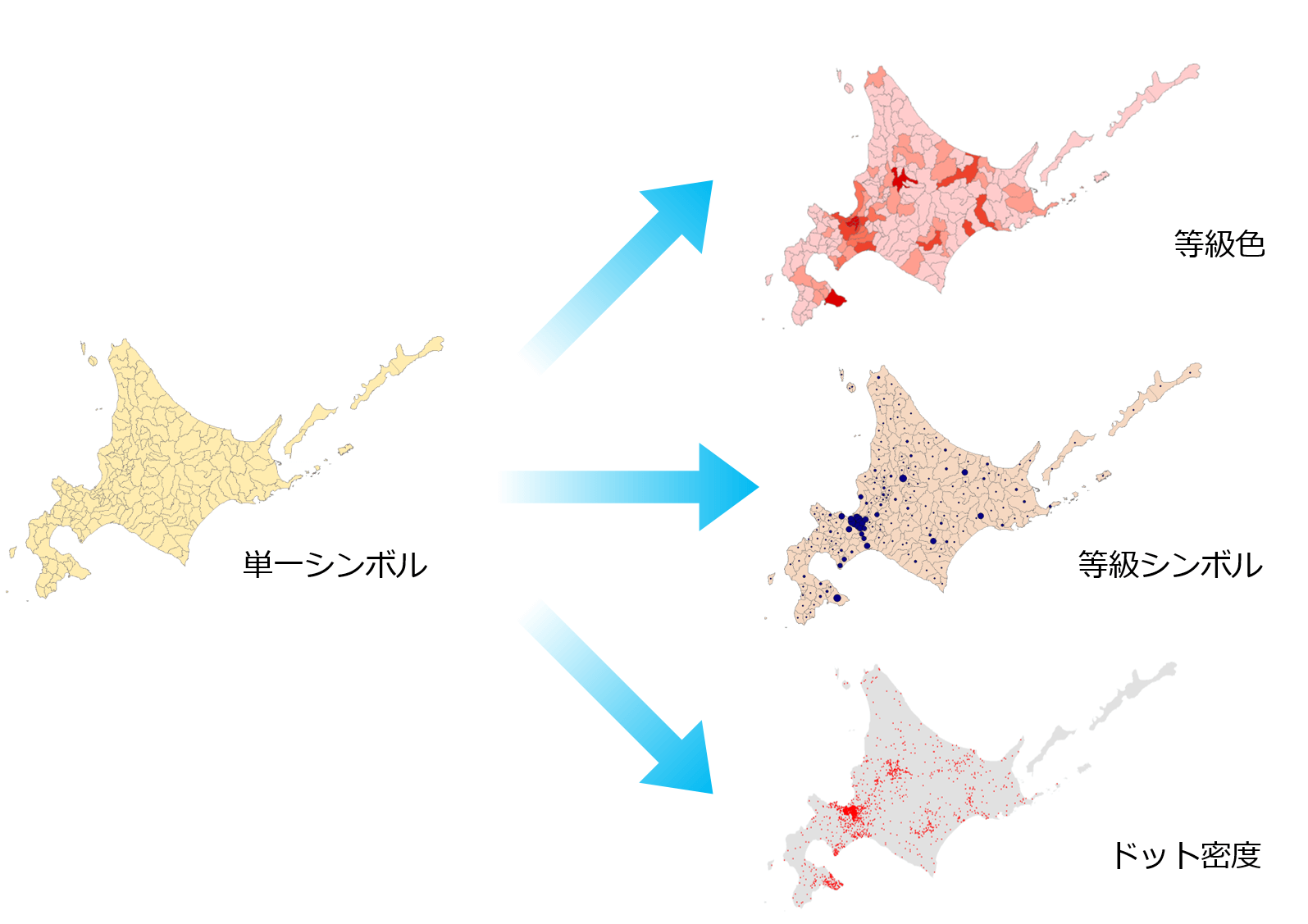 ArcGIS では皆さんがお持ちの GIS データを地図上に描画する際、さまざまな表現が可能です。例として北海道の市区町村のデータで人口をどのように表現できるか見てみましょう。下図のように人口に応じて色分けすることもできますし、ポイントの大きさを変えて表現することもできます。他にも人口 3,000 人を 1 ドットで描画すると北海道全体の人口の分布傾向が見やすくなります。このように同じ人口であっても方法次第で違った見せ方ができます。