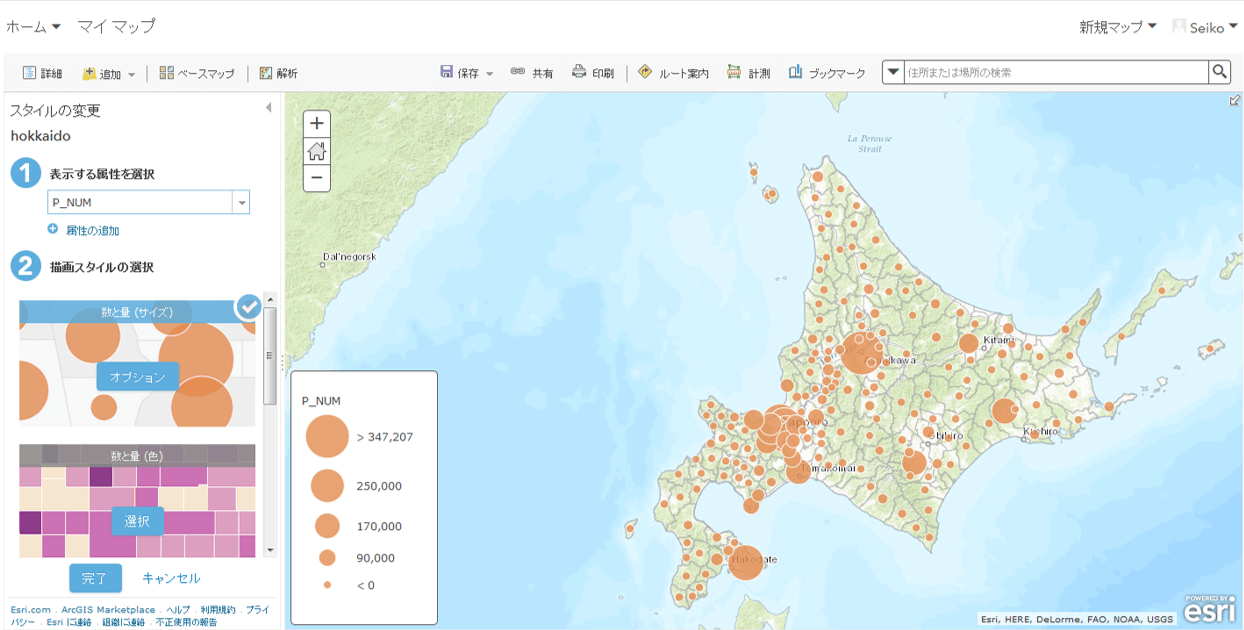ArcGIS Online マップ ビューアーにはスマート マッピングの機能が実装されています。この ArcGIS Online マップ ビューアーに先ほどと同じ北海道の市区町村のデータを追加すると表示されているベースマップに応じてシンボルが設定されます。