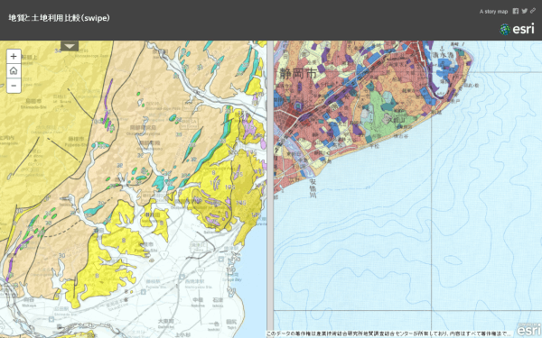 左側に地質図、右側に土地利用図が表示されており、真ん中のスライド バーを左右に動かして表示を切り替えることができます。マップ タイルが同じ仕様で作成されていれば、異なる機関から公開されたいろいろな情報を重ね合わせて表示し、知見を得ることが可能です。