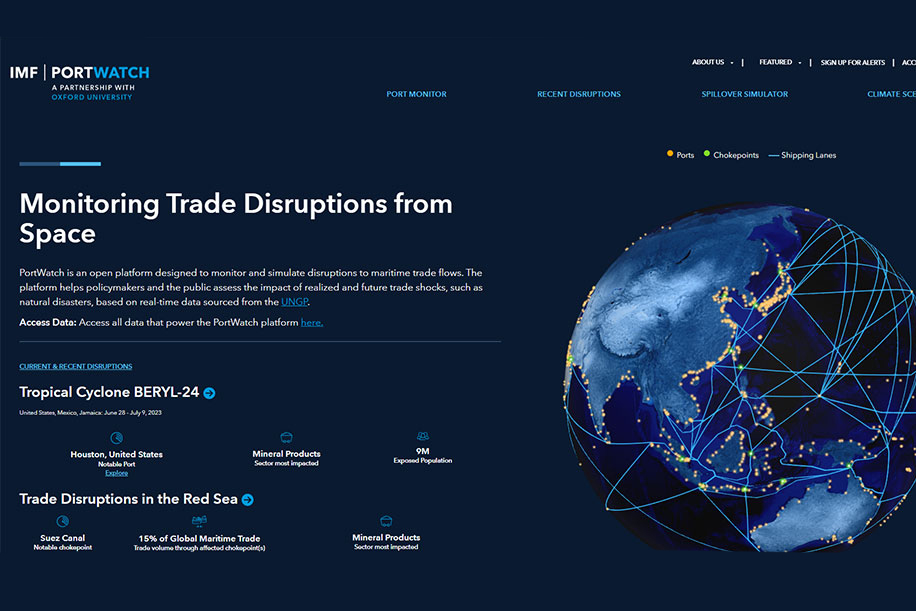IMF とオックスフォード大学は、港湾の災害影響を予測・分析する「PortWatch」を開発。人工衛星データと GIS 技術を利用し、港湾活動を監視し、世界貿易への影響をシミュレーション。